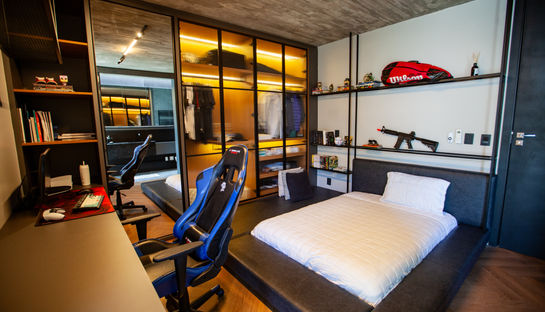 Na área intima, as paredes duplas e as esquadrias com vidro duplo e persiana elétrica, tornam o conforto térmico e acústico ideal para descanso e, na piscina de concreto integrada com a churrasqueira e a cozinha.